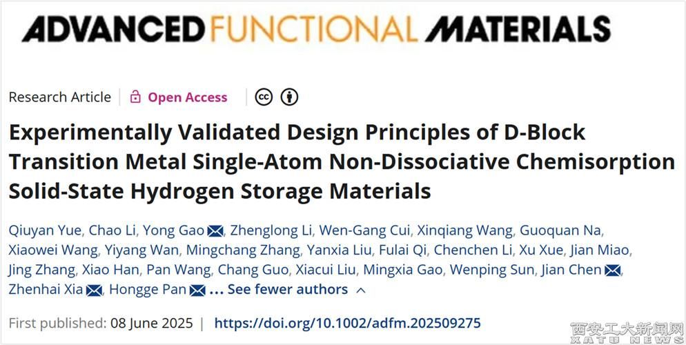 (本网讯)近日,国际知名期刊《Advanced Functional Materials》(中科院分区1区,Impact factor = 18.50)刊发了我校新能源科学与技术研究院2023级硕士研究生岳秋妍关于非裂解型化学吸附碳基单原子固态储氢材料的最新研究成果。论文题目为“Experimentally Validated Design Principles of D-Block Transition Metal Single-AtomNon-Dissociative Chemisorption Solid-State Hydrogen Storage Materials”。岳秋妍为文章第一...