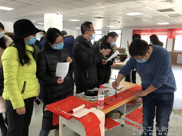 (本网讯)牛来鼠去远,春到景更新。在新春佳节即将来临之际,校工会联合中国书法学院师生,在未央校区教师活动中心为教职工书写春联。 活动特邀中国书法学院10余位师生为教职工现场书写赠送春联。老师们根据新年心愿定制春联内容,书法学院师生挥毫泼墨,共书写赠送春联800余幅,既弘扬了中华传统文化,也加强了教职工之间的交流互动。红红的春联、浓浓的祝福、开心的笑脸融合在一起,绘成了一幅幅感人的画面。文:乔璐 图:乔...