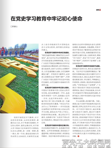 (本网讯)近期出版的《当代陕西》杂志第7期刊登我校党委副书记、纪委书记、监察专员郑建山署名文章《在党史学习教育中牢记初心使命》。 中共中央印发《关于在全党开展党史学习教育的通知》,就党史学习教育作出部署安排,我校也就党史学习教育制定实施方案,认真谋划、周密组织。《在党史学习教育中牢记初心使命》文章,突出强调了在党史学习教育中要注重把握传承红色基因、牢记初心使命、坚持正确方向、创造时代成绩四个方面...