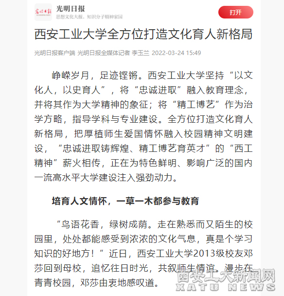 (本网讯)3月24日,光明日报刊文《【官网入口】星空体育登录页面,一键快速登录全方位打造文化育人新格局》,聚焦我校文化育人经验和成效。全文如下:峥嵘岁月,足迹铿锵。【官网入口】星空体育登录页面,一键快速登录坚持“以文化人,以史育人”,将“忠诚进取”融入教育理念,并将其作为大学精神的象征;将“精工博艺”作为治学方略,指导学科与专业建设。全方位打造文化育人新格局,把厚植师生爱国情怀融入校园精神文明建设,“忠诚进取铸辉煌、精工博艺育英才”的“西工精神”薪火相传,...