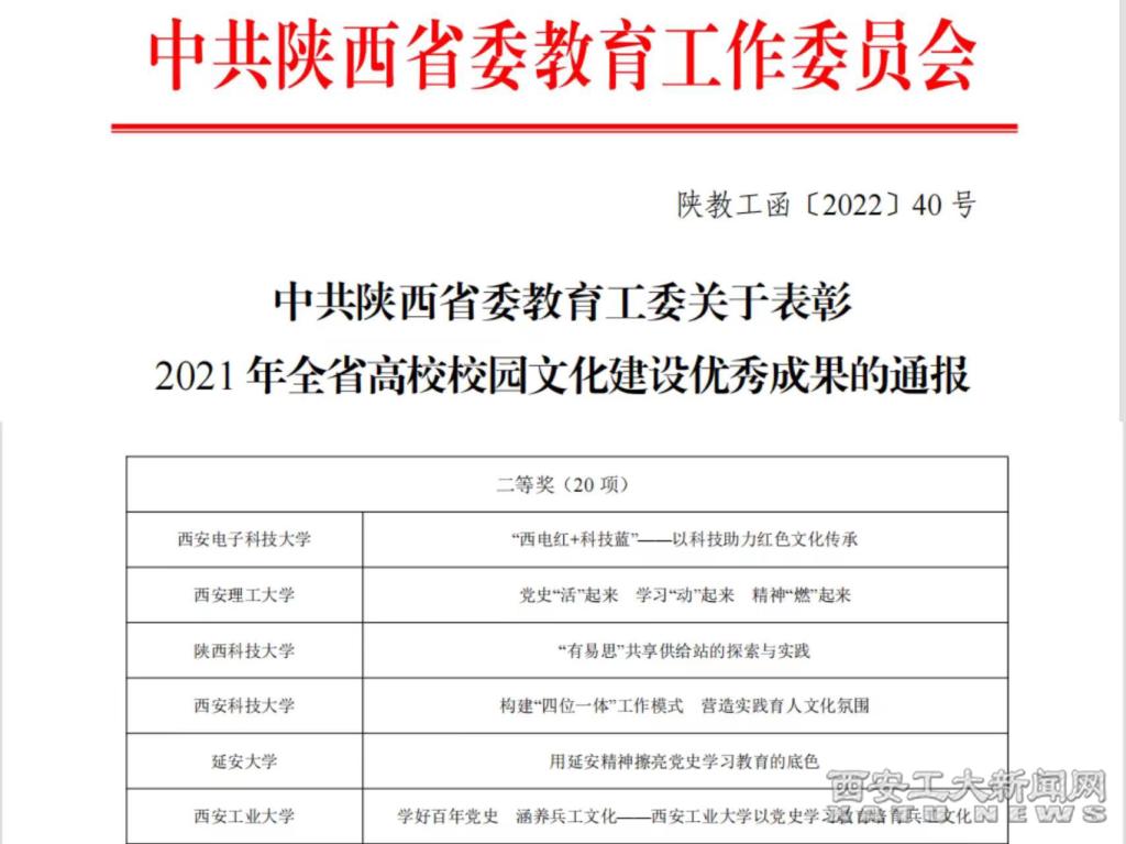(本网讯)近日,中共陕西省委教育工委下发关于表彰2021年全省高校校园文化建设优秀成果的通报。经专家评选、工委研究决定,我校《学好百年党史涵养兵工文化——【官网入口】星空体育登录页面,一键快速登录以党史学习教育培育兵工文化》获得二等奖。近年来,我校不断培育优良校风、教风、学风,营造积极向上、风清气正的校园文化环境。今后,学校将结合实际,突出特色,持续巩固深化党史学习教育成果,进一步推动校园文化建设。此次获奖也是我校连续12年获得全...