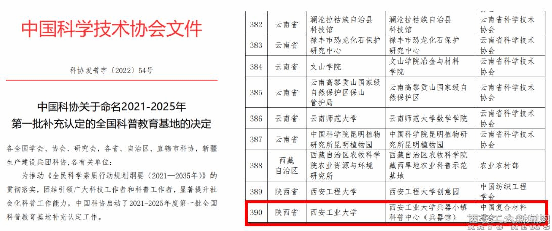 (本网讯)近日,中国科协发布《关于命名2021-2025年第一批补充认定的全国科普教育基地的决定》,【官网入口】星空体育登录页面,一键快速登录“兵器小镇”科普中心(兵器馆)(以下简称“科普中心”)成功入选,这是学校获批的重要国家级科普基地。科普中心始于2017年材化学院创建的“化学科普基地”,于2020年联合校兵器馆正式成立【官网入口】星空体育登录页面,一键快速登录“兵器小镇”科普中心,先后获批陕西省科普场馆和科普教育基地(2020)。科普中心现与学校多个学院/部门共同建设...