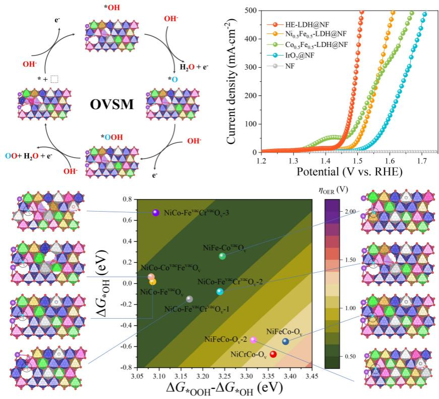 (本网讯)近日,我校姚尧教授团队在国际顶级期刊《Advanced Energy Materials》(近五年影响因子为27.3)上发表“Deciphering the Synergy of Multiple Vacancies in High-Entropy Layered Double Hydroxides for Efficient Oxygen Electrocatalysis”的研究型论文。如何调控晶格氧氧化机制活性与稳定性之间存在的固有矛盾,成为当前碱性电解水制氢技术发展的核心问题。论文基于理论计算及原位电化学分析,阐明了多种金属空...