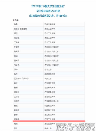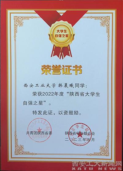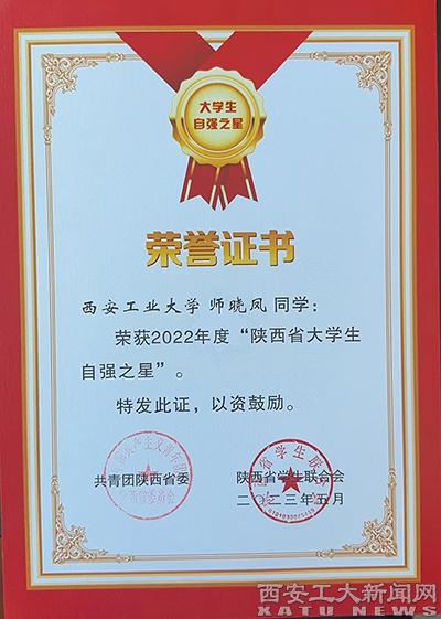 早在今年5月,我校推报的计算机学院软件工程专业2020级韩晨曦同学同时获得了2022年度“陕西省大学生自强之星”荣誉称号。