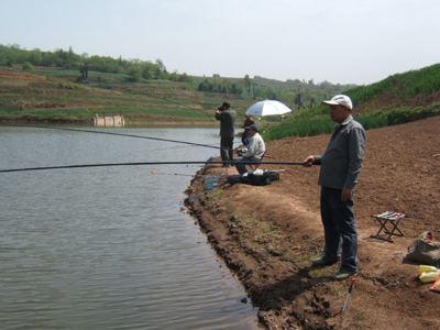 经过一个多小时的奔波来到了位于蓝田的厚镇水库,在这里举行今年的钓鱼比赛。离退办副主任刘晓青强调了安全问题,退休科长崔志安宣布了比赛规则。之后老同志们很快便投入到钓鱼比赛之中。他们钓技娴熟,个个精神抖擞,容光焕发。各位参赛者凝神静气、不急不躁、耐心守候在自己的钓竿旁边,不久,竿动标沉,一条条经不住诱惑的鱼儿纷纷上钩,大家战果颇丰。