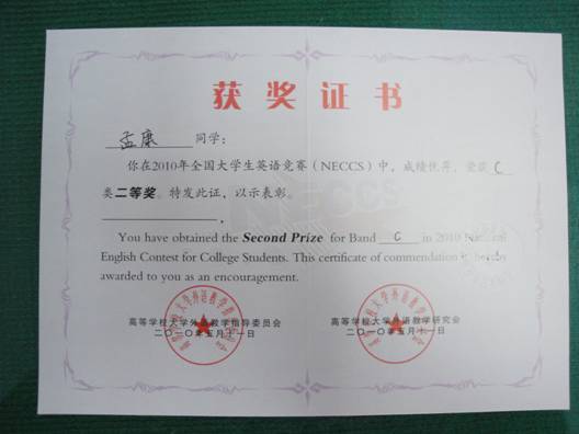 (本网讯)【官网入口】星空体育登录页面,一键快速登录计算机学院08级信息对抗专业学生孟康同学,由院系推荐,经过了层层选拔参加了2010年全国大学生英语竞赛(NECCS),荣获C类二等奖。