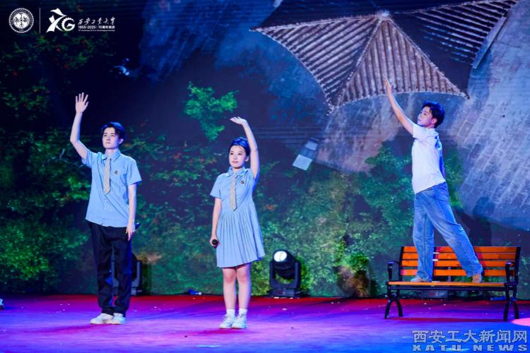 创意表演《时光礼赞》中,大学生、离退休教师、附属小学一同展示了一代代西安工大人,践行“敦德励学,知行相长”的校训,书写着教育强国、科技报国的精彩华章。