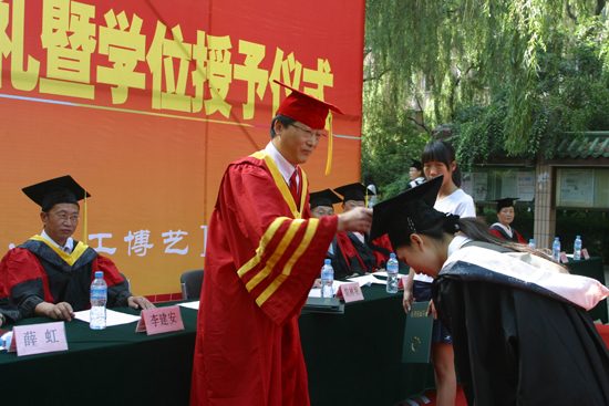 在激昂的毕业歌中,校长刘江南、学院党委书记简林根等领导分别为取得学士学位证书的毕业生拨穗,授予学位证书,并合影留念。