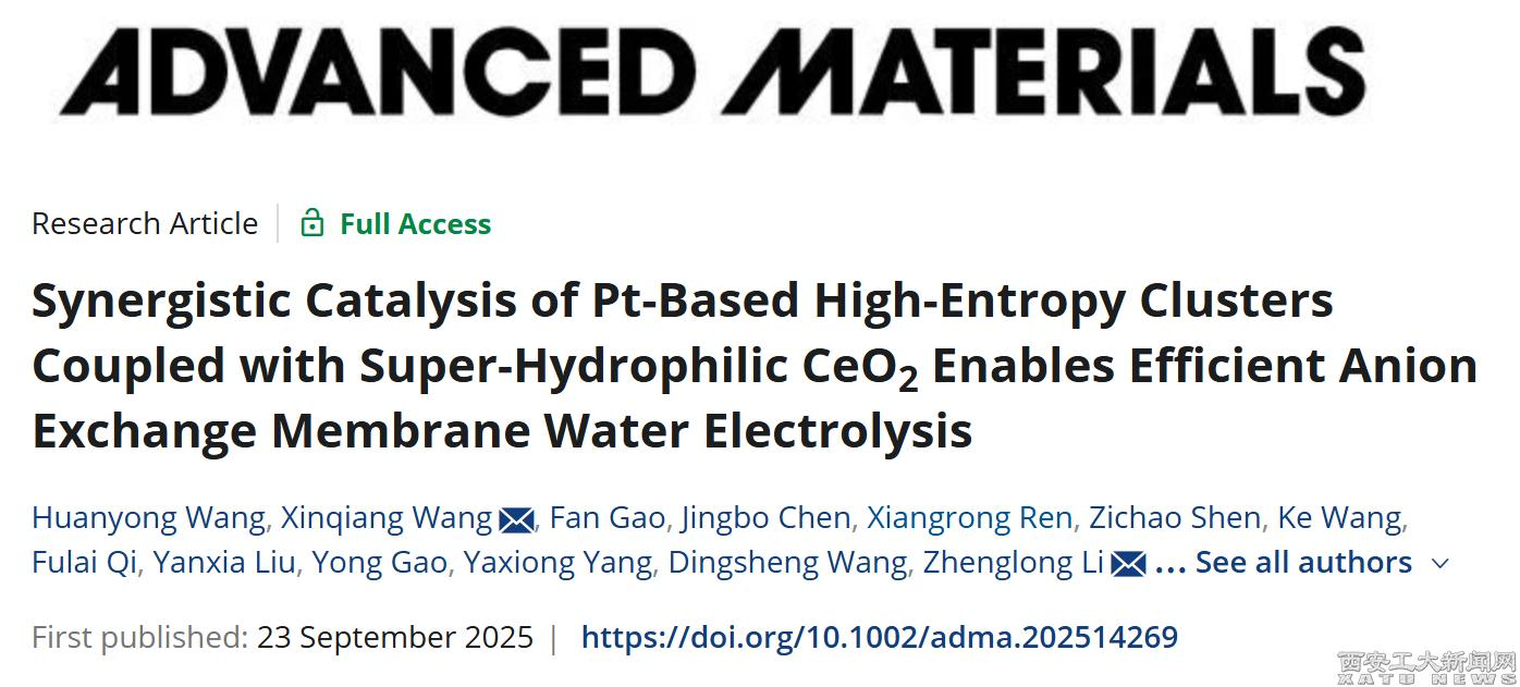 (本网讯)近日,我校新能源科学与技术研究院博士研究生汪焕勇以第一作者在国际知名期刊《Advanced Materials》(IF=26.8)上发表了一篇题为《Synergistic Catalysis of Pt-Based High-Entropy Clusters Coupled with Super-Hydrophilic CeO2Enables Efficient Anion Exchange Membrane Water Electrolysis》的文章,指导老师为青年教师王新强,【官网入口】星空体育登录页面,一键快速登录为第一单位。近三年,新能源科学与技术研究院在国际知名期刊上发表SCI论文300余篇,为我校建设高水平研究型大学提供了有力支撑。
