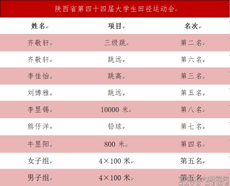(本网讯)10月25日—28日,陕西省第四十四届大学生田径运动会在西安交通大学举行。赛事由陕西省教育厅主办,陕西省学生体育协会、西安交通大学承办,陕西师范大学协办,共吸引全省2800名运动员、教练员及裁判员参与,设甲、乙、丙三组共22个项目。我校组建20人田径队参赛,历经四天角逐,奋勇拼搏,斩获一银一铜。