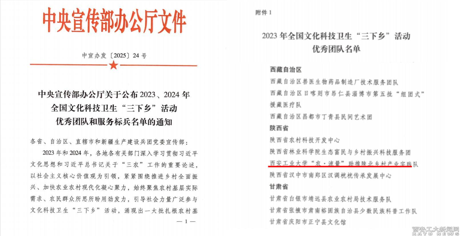 (本网讯)近日,中央宣传部办公厅印发的《关于公布2023、2024年全国文化科技卫生“三下乡”活动优秀团队和服务标兵名单的通知》(中宣办发〔2025〕24号),公布了全国优秀团队和服务标兵名单。我校“农·流量”助推陕北乡村产业实践队成功入选优秀团队,陕西省2023年共有4个团队受表彰,我校是省内唯一获此殊荣的高校。