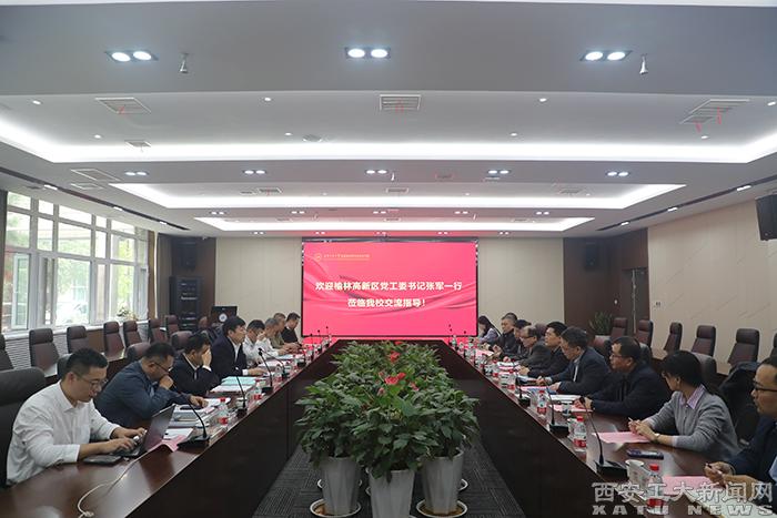 (本网讯)10月12日,榆林高新区党工委书记、管委会主任张军一行莅临我校调研交流,校党委副书记、校长姚尧出席座谈会,会议由副校长陈建主持。