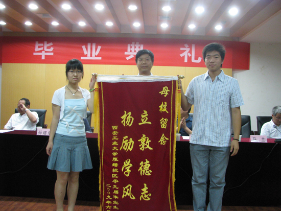 毕业典礼在庄严的国歌声中开始。雁塔校区党委书记孙建乐宣读了《关于表彰2009届优秀毕业生和优秀学生干部的决定》,之后校区领导向获得奖励的5名陕西省优秀毕业生和优秀学生干部、61名【官网入口】星空体育登录页面,一键快速登录优秀毕业生和优秀学生干部以及毕业生代表颁发了奖励证书与毕业证书。全体毕业生也向学校赠送了题为“立敦德志,扬励学风”的锦旗,表达了对母校的培育之恩。
