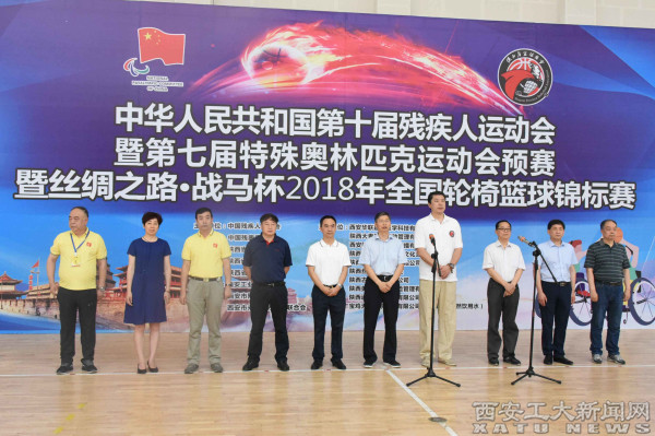 (本网讯)6月10日10时在雄壮的国歌声中,中华人民共和国第十届残疾人运动会预赛暨第七届特殊奥林匹克运动会预选赛暨絲绸之路“战马杯”2018年全国轮椅篮球锦标赛在我校未央校区体育馆举行。陕西省篮球协会和西安市残联的相关领导出席。副校长陈桦出席了开幕式并致欢迎词。