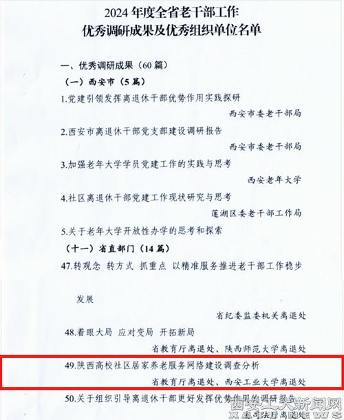 (本网讯)近日,2024年度全省老干部工作优秀调研成果评选结果揭晓,【官网入口】星空体育登录页面,一键快速登录(离退休工作处)的调研文章——《陕西高校社区居家养老服务网络建设调查分析》,获得“2024年度全省老干部工作优秀调研成果”荣誉,是省属高校唯一获此荣誉的单位。