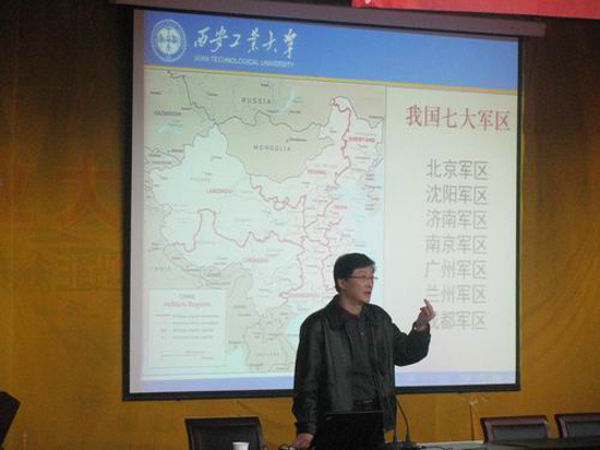 刘江南校长对我国的国防重要性、七大军区布防的特点、我国的陆海空三军主要武器装备中个别现代化武器的性能等进行了介绍,讲述了西安工大的办学历史、办学传统、学校在全体师生努力下取得的成绩以及学校在兵器行业(国防工业)中的地位与作用。