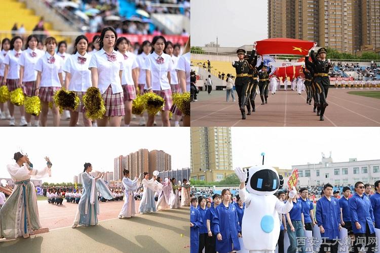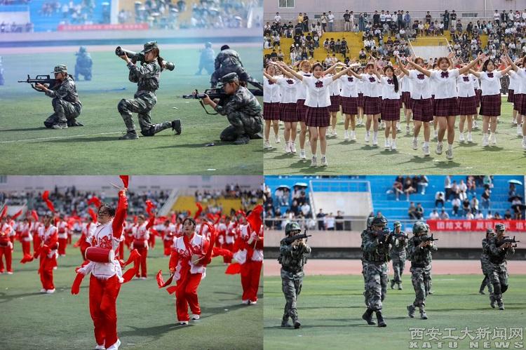 开幕式文体表演精彩纷呈,《鼓舞青春 共庆辉煌》腰鼓表演以激昂的节奏和有力的鼓点敲响青春旋律,展示学校文化的深厚底蕴和民族精神的传承;《喜迎八方 梦想起航》健美操表演以七十载华章为笔,蘸取星河璀璨,在西安工大舞台勾勒梦想的年轮,向大家宣示独属于年轻人的青春、激情与活力;《兵工风采 国防担当》军体拳战术表演彰显国防精神,为盛会添彩,展现青春风采与担当。