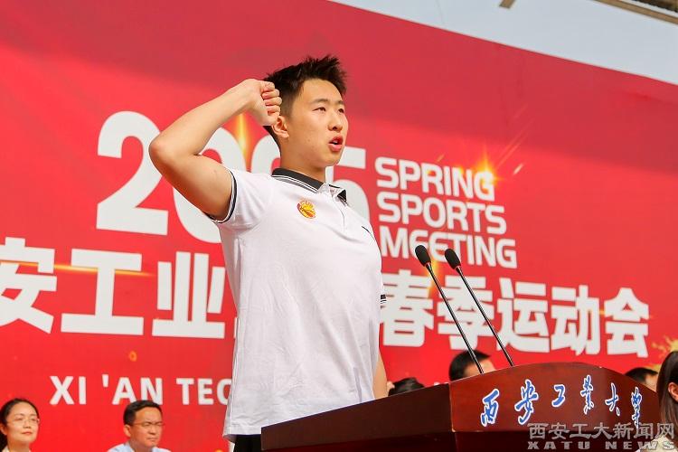电子信息工程学院周明宇同学代表全体运动员宣誓。新生院教师周莎莎代表全体裁判员宣誓。