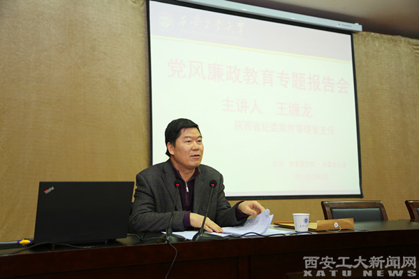 (本网讯)12月7日,学校举办党风廉政教育报告会,邀请陕西省纪委案件审理室主任王缠龙作“全面从严治党永远在路上”专题辅导。党委书记刘卫国主持报告会。
