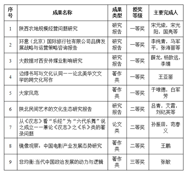 (本网讯)近日,陕西省教育厅公布了2017年度陕西高等学校人文社会科学研究优秀成果奖获奖名单,我校荣获9项优秀成果获奖,其中一等奖5项,二等奖3项,三等奖1项。具体获奖成果如下: