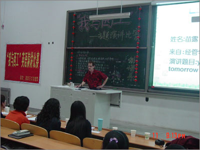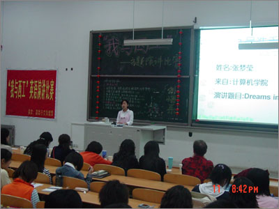 来自研究生部的赵欣楠,发音标准、表情自然,赢得了台下同学的阵阵掌声。他在演讲中鼓励同学们在课余时间积极参加学校组织的各项活动,利用假期打工以积累社会经验,使在场同学颇受启发。来自材化学院的刘梅同学流利而精彩的演讲也获得了评委和同学们的一致好评。电信学院的王浩同学富有表情且内容充实的“THE TRAIN IS MOVING”,最终夺得了本次比赛的桂冠。