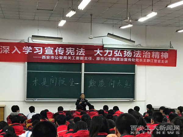 (本网讯)12月1日,在法制教育宣传日来临之际,我校附中邀请西安市关工委副主任、市公安局政治部宣传处原处长王静江警官,为附中200余名师生进行了法制教育报告。