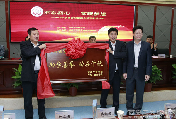 (本网讯)10月12日,由陕西省安徽商会发起的“不忘初心 实现梦想”徽商捐资助学活动在我校举行。陕西省安徽商会会长张金龙,我校校长刘卫国、党委副书记吴介军,西安科技大学党委副书记樊建军出席,皖藉企业家以及来自陕西师范大学、长安大学、西安理工大学、西安科技大学、西安外国语大学和我校的师生代表共200余人参加了捐助仪式。