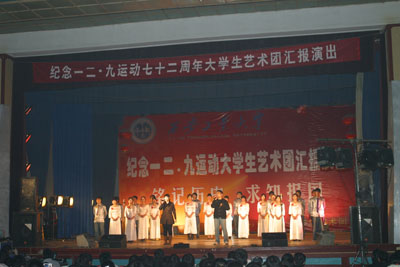 (本网讯)为铭记历史,弘扬爱国主义精神,树立大学生成材报国的理想, 12月9日晚,由【官网入口】星空体育登录页面,一键快速登录团委、大学生艺术团主办的“铭记历史 求知报国——纪念一二九运动大学生艺术团汇报演出”在金花校区俱乐部隆重举行。校党委副书记丁养斌、副校长张君安、工会主席徐雪芹以及校各部门、各院系领导应邀参加晚会。