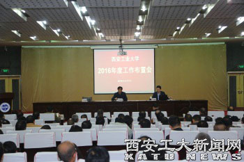 刘卫国指出,2016年学校工作的总目标是:提高全员的凝聚力、向心力,提高学校的综合影响力和社会贡献度。他分析了当前发展形势与环境,指出要科学地认识学校发展面临的诸多压力,进一步深化改革,科学规划,强化党对学校教育事业发展的领导;进一步在突出办学特色、培养体系构建、人事制度改革、学科评估、审核评估、兵研院建设等重点工作上取得新突破。刘卫国强调,全面实施目标责任制,要以立德树人为核心、校风校训为内涵的大学文化建设,以科学技术研究和教育教学研究为两翼的学术研究体系建设,以办学质量和水平不断提升为目标的开放大学建设,以学生管理体系更加完备为抓手的学生能力建设为基础工作的要点。刘卫国指出,要以纪律和制度、组织和人力资源、资金为保障创造更好的工作、学习、生活环境,随后详细解读了2016年学校40条工作要点。