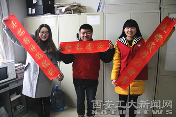 艺术与传媒学院团委、校青年志愿者协会、学生会以及书法协会组织同学们为我校师生准备了六百余幅充满喜气和祝愿的春联。1月20日至22日志愿者们走进教学楼、宿舍楼以及食堂,将准备好的三百余幅春联赠送给我校教师、公寓管理人员和食堂的师傅们,并送上了新春的祝福。