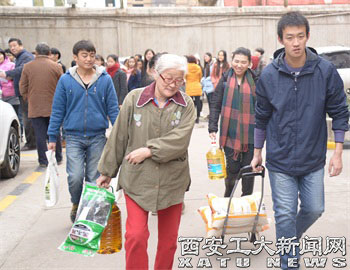 (本网讯)近日,离退处为老同志发放年终福利,艺术与传媒学院组织百余名学生志愿者,将米面油送至老人家中,得到了广大离退休职工欢迎。