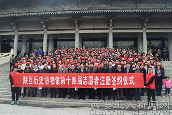 我校陕历博志愿服务队61名志愿者将于2015年11月22日至2016年11月22日在陕西历史博物馆进行志愿服务工作,该服务队由我校外国语学院团委、学生会于2013年组建成立并面向全校征集志愿者。