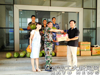 (本网讯)近日,校工会一行带着慰问品来到未央校区慰问参加学校2015级新生军训的教职工,为他们送去了清凉。