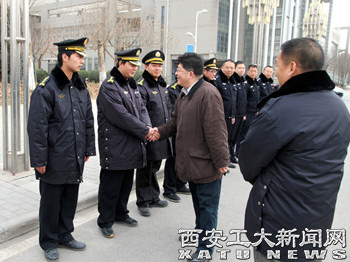 (本网讯)春节前夕,校党委副书记于孟晨带领校工会同志在未央校区慰问了寒假期间仍然坚守岗位值班的保卫处执勤人员和总务处后勤值班人员。