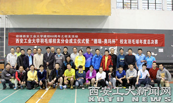(本网讯)11月8日,我校羽毛球校友分会成立仪式暨“德瑞-奥玛杯” 教工与校友羽毛球年度总决赛在金花校区体育馆成功举行,来自西安地区的30多位校友与教职工羽毛球协会的会员共同见证了这一盛事。副校长、校友总会副理事长刘建勋参加。