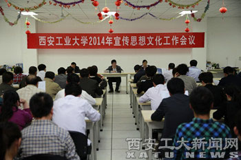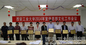 党委宣传部副部长骞军荣做2013年宣传思想文化工作总结并宣读上级和学校的表彰文件。2013年我校荣获陕西省高校校园文化建设优秀成果一等奖一项,“陕西高校新闻奖”特等奖一项、一等奖三项,有10个单位、32名师生获得学校表彰。