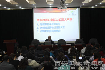 讲座中,刘鹏老师首先剖析了中国教师职业压力的来源,继而用幽默的语言、生动的案例以及大量心理学知识,讲述了自己从事教师职业以来的经历和感悟,并结合教师职业的特点,理论联系实际地对教师该如何克服职业倦怠感、如何协调人际关系、如何树立良好的职业心理素质、如何提升教师职业幸福感等方面进行了剖析,并给出了具体可行的操作方法。