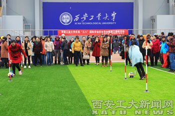 (本网讯)3月7日下午,为庆祝“三八”国际劳动妇女节,西安工大工会、女教职工委员会组织全校女教职工开展趣味活动,近500名女教职工参加了此次活动。副校长雷亚萍代表学校领导向全校女教职工致以节日的问候与祝福,对广大女教职工在学校发展建设中做出的重要贡献给予了充分肯定。