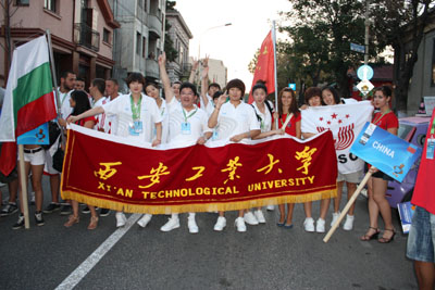 在之前的开幕式上,我校女篮队员李煊代表所有参赛国运动员宣誓。赛前市政府组织参赛队伍举行了全城游行,一袭白色战袍的西安工大女篮引起了塞尔维亚民众及当地华侨的极大热情与关注。