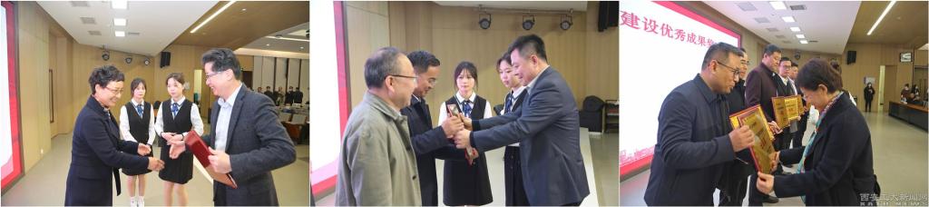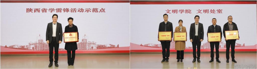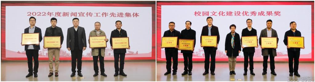 校领导分别为获得2022年“陕西省学雷锋活动示范点”“文明学院”“文明处室”、新闻宣传工作先进集体和校园文化建设优秀成果奖的代表颁奖。