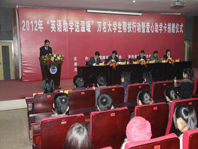 四海嘉华科技有限公司(嘉学网)总裁文小红讲话,他说:“他非常理解英语水平较低对一名大学生综合素质和能力发展的限制,联合共青团陕西省委举办这样的活动,他们正好有能力参加进来帮助大家也是他们非常高兴的。”最后,团省委副书记张小平作了总结讲话。他感谢四海嘉华科技有限公司的捐助和各高校团委的支持,使这次送温暖工作顺利开展,也希望所有受到帮助的学生努力学习,充分合理的利用好这些助学卡提高成绩回报社会。