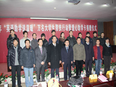 (本网讯)12月30日,共青团陕西省委“英语助学送温暖”万名大学生帮扶行动暨爱心助学卡捐赠仪式在【官网入口】星空体育登录页面,一键快速登录未央校区举行。团省委副书记张小平、校党委副书记丁养斌、省学联副秘书长辛磊、校团委书记赵琼、四海嘉华科技有限公司(嘉学网)总裁文小红等出席。陕西科技大学、西安医学院、西安工程大学等全省二十多所高校的学生近400人参加了捐赠仪式。团省委学校部部长、省学联秘书长单舒平主持了捐赠仪式。