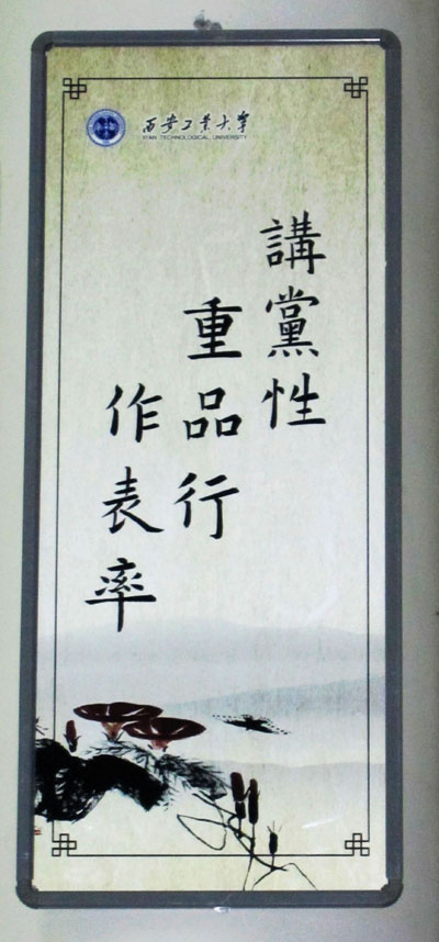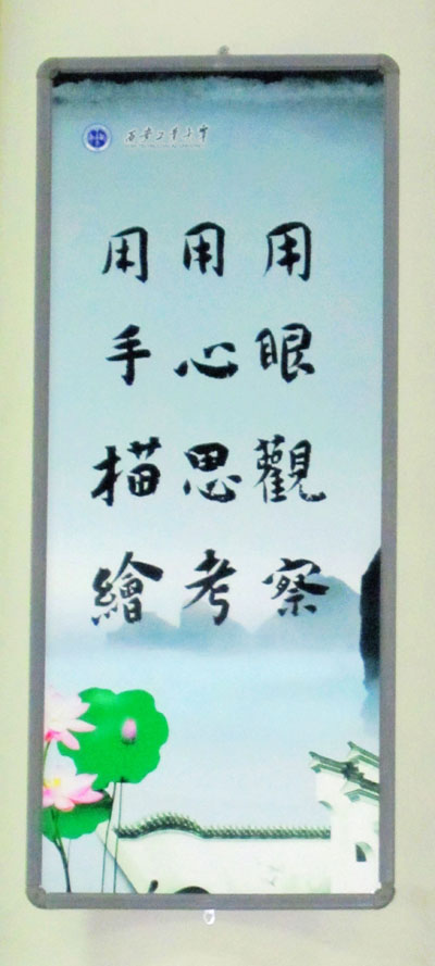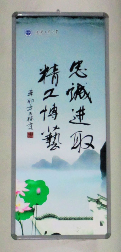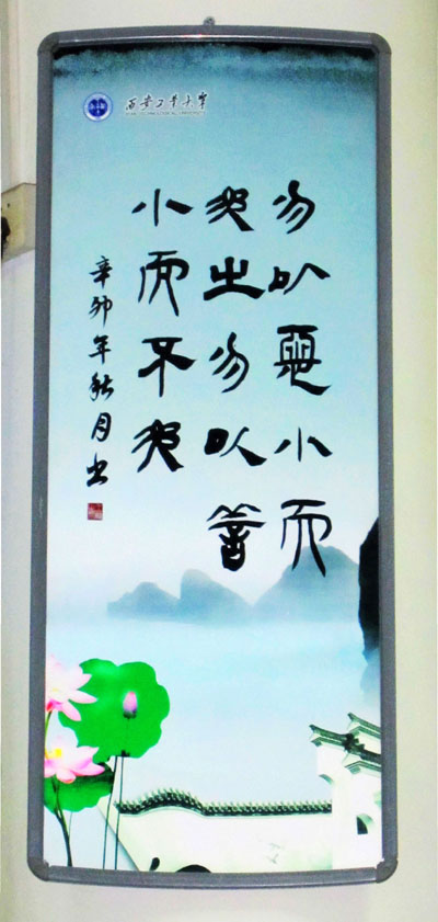 走进未央校区食堂里,一块块崭新的文化廊柱标牌、励志格言映入眼帘。于书记指出:活动发挥了我校艺术与传媒学院书法专业学生的专长,践行了党的十七届六中全会精神。有利于我校环境育人、文化育人的深入,加强了校园文化建设。