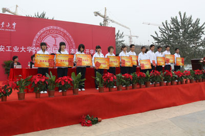 开学典礼在嘹亮的国歌声中拉开序幕,学生处处长任慧英介绍了2011年的招生情况并宣读国亮奖学金获奖名单,冯佩珍等11位新同学获此殊荣上台领奖。