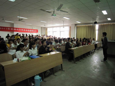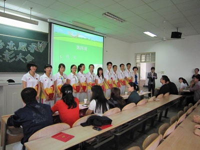 随后,团委赵伟奇宣布获得2011西安世园会优秀志愿者名单,团委翟超为他们颁发证书,赵琼为他们佩戴了世园会金蜜蜂徽章;接着,两位志愿者之星代表黄超与朱玲伟同学分别上台做了简短的发言,讲述了他们在服务世园期间难忘的经历以及各自的收获;B20小组的小蜜蜂们还为大家表演了一幕简单的话剧,重现了她们在世园会锦绣门时的服务经历。