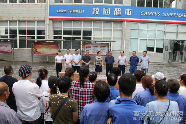 (本网讯)8月3日,校长雷亚萍、副校长祁玉龙对暑期坚守一线岗位的后勤职工进行慰问,并为大家发放了解暑慰问品。