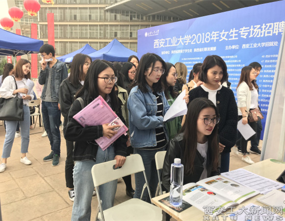 (本网讯)4月11日,我校2018年女生专场招聘会在经纬广场圆满举行。西安科佳光电科技有限公司、陕西省建设法制协会、北京高思博乐教育科技股份有限公司、立讯精密工业股份有限公司、友达光电(昆山)有限公司等省内外86家企业携940个就业岗位来到现场招揽人才。陕西省妇联发展部对我校举办本次招聘会提供了政策指导和大力帮助,并推荐了部分优秀企业前来招聘。