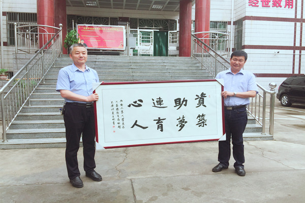 自我校结对帮扶大荔县学生资助管理中心10年以来,学校每年都要组织开展包括办公设备捐赠、学生网络预约办理贷款软件开发、学生暑期勤工助学、协助毕业生贷款回收等系列帮扶活动,建立了良好的常态化帮扶互动机制,结对帮扶工作成效显著,被帮扶单位满意度高。大荔县教育局局长薛彦荣将写有“资助连心,筑梦育人”的书法作品赠送我校以示感谢。
