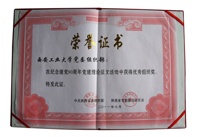 在陕西省委组织部和陕西省党的建设研究会共同组织的建党90年征文活动中,由西安工大陆钢撰写的《高校学生党建工作探析》一文荣获一等奖。西安工大党委组织部同时荣获全省高校唯一的优秀组织奖。