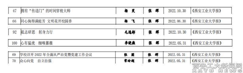 “陕西高校新闻奖”是陕西高校校报优秀新闻作品最高奖,由陕西省高校校报研究会主办。在此次评选中,杨笑撰写的《拥有“传送门”的时间穿梭大师》获通讯类一等奖;杨飞撰写的《同心掬得满庭芳 文明花开校园香》,毛逸彬撰写的《砥志研思 躬身力行》,李晓燕撰写的《心有猛虎 细嗅蔷薇》获得通讯类二等奖。张圆撰写的《学校召开2022年全面从严治党暨党建工作会议》和常玢超撰写的《众心向党 自立自强》获得消息类二等奖。